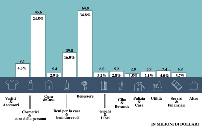 I prodotti per la cosmesi e la cura personale (24,5%) e i prodotti per il benessere (34,8%) insieme rappresentano oltre il 59% delle vendite nella categoria. I beni per la casa e i prodotti durevoli sono passati dal 14,4% nel 2020 al 16,0% nel 2021, mentre l’abbigliamento e gli accessori sono diminuiti dal 4,7% al 4,5%.